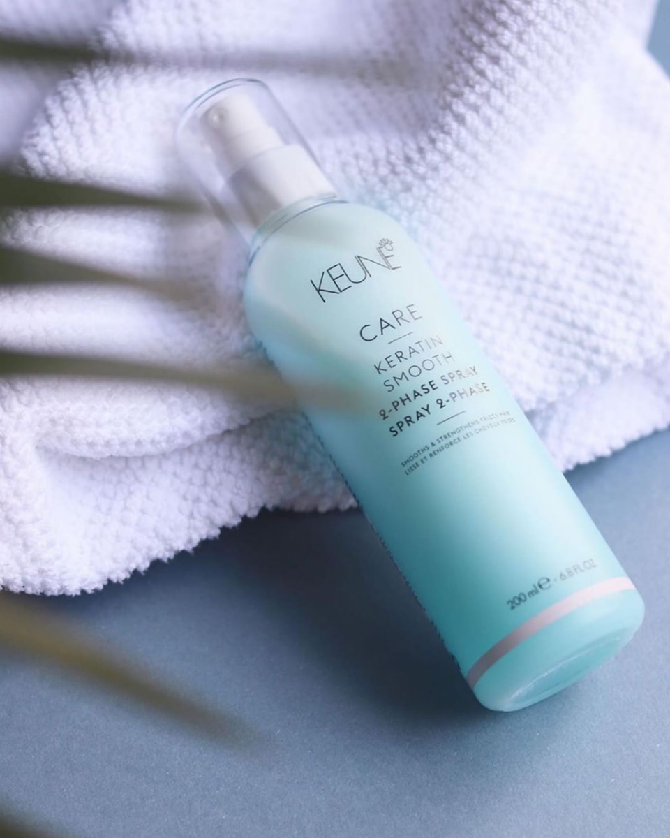 Збовтайте флакон з кондиціонером Keune Care Keratin Smooth для змішування двох фаз і розпиліть на волосся.